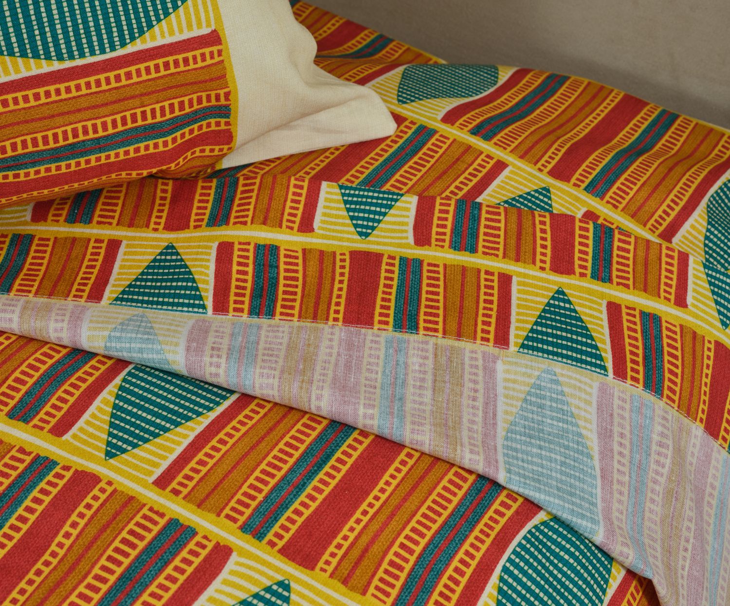 Drap plat avec un parement de 40 cm au dos: sur le lit, tous les motifs sont apparents. L’usage d’un couvre-lit n’est plus nécessaire.
