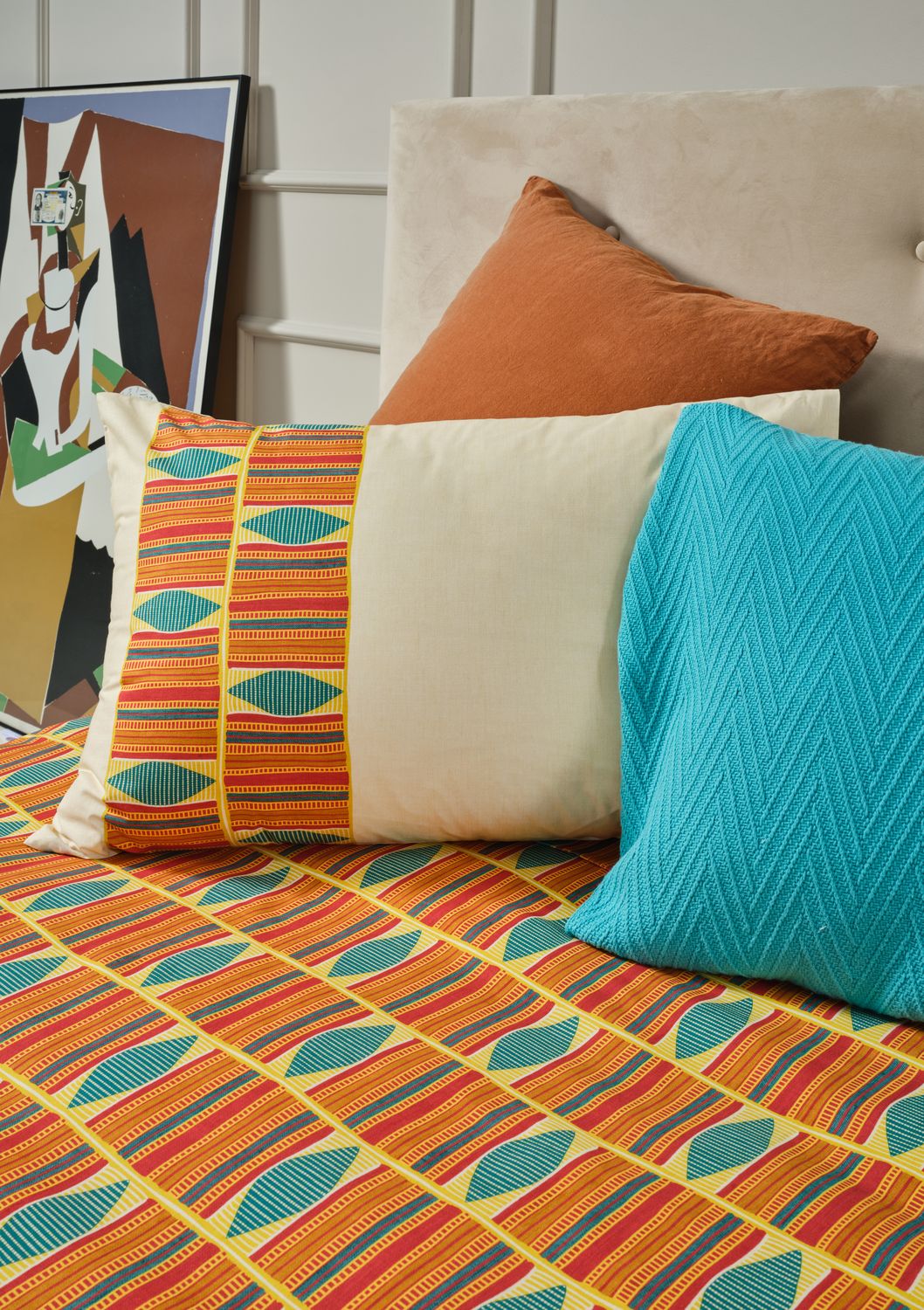 Imprégnez-vous de la belle et saisissante Adjowa. Une collection d’exception qui fusionne tradition et modernisme. Les motifs et les couleurs vives se mêlent pour donner vie à une toile unique et surprenante. Les irrégularités voulues au niveau de l’impression des motifs nous feraient presque croire que c’est un pagne tissé, sorti tout droit des ateliers d’artisans Ewe du Ghana. Imaginez cette merveille dans votre chambre! N’hésitez plus, adopter la!